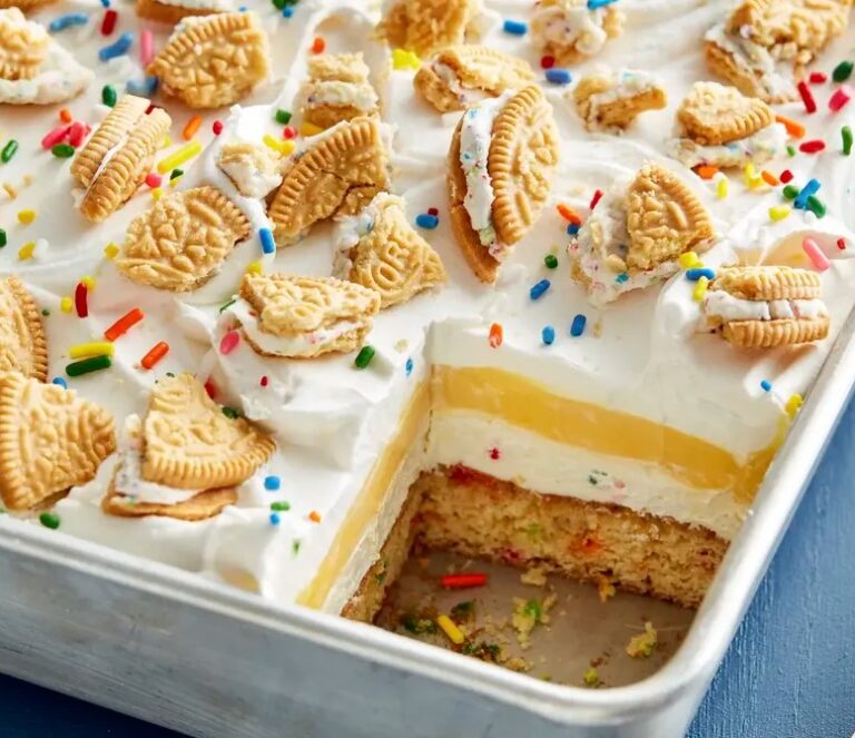 This Cake Batter Lush Dessert is one of those recipes that makes everyone smile — whether you’re serving it for a birthday, a cookout, or just a “because it’s Tuesday” treat. It’s creamy, colorful, and crazy-easy to make. You don’t need an oven, and you don’t need to fuss. Just mix, layer, chill, and enjoy.