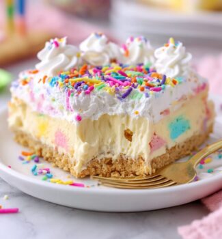 This dessert is smooth, creamy, and light — like cheesecake meets birthday cake meets pudding pie. The crust gives a buttery, slightly crunchy contrast that grounds the creamy layers. And thanks to that hit of dry cake mix in the pudding, every spoonful carries that unmistakable cake batter flavor — sweet, a little vanilla-y, and totally irresistible.