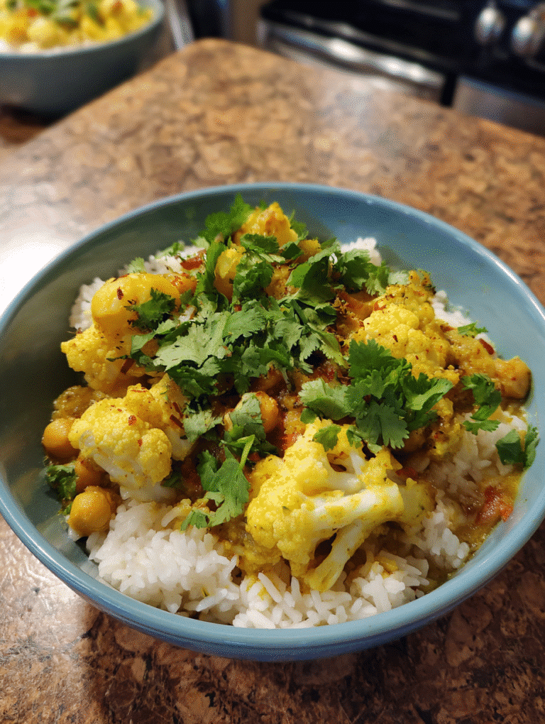 A creamy and comforting vegan curry featuring cauliflower and chickpeas, infused with the rich flavors of coconut milk and turmeric.