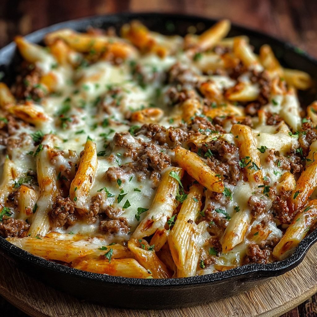 A delicious and comforting dish featuring penne pasta tossed with a rich garlic butter sauce and savory ground beef, topped with melted cheese.