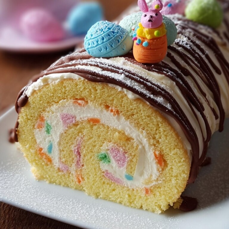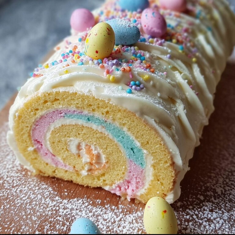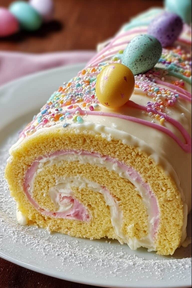 Easter Cake Roll is a light, festive sponge cake filled with fluffy vanilla cream and finished with pastel sprinkles or mini chocolate eggs—an elegant centerpiece that slices beautifully and delights every guest.