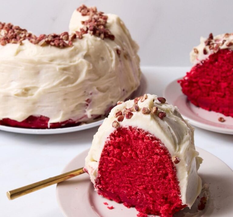 This isn’t your average bundt cake. It’s a glorious fusion of two beloved desserts: rich red velvet cake and creamy cheesecake. The batter bakes up tender and fluffy thanks to buttermilk and oil, while a velvety cheesecake center melts into each slice like a hidden treasure. Topped with cream cheese frosting and ruby red velvet crumbs, this cake is as dazzling on the plate as it is on the tongue.