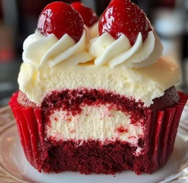 If there’s one recipe that screams celebration and indulgence, it’s this: Strawberry Cheesecake Red Velvet Cupcakes. These little beauties are more than just a cupcake — they’re a dessert experience. Moist red velvet cake with a surprise creamy cheesecake center, topped with dreamy vanilla cream cheese frosting, a glossy strawberry glaze, and fresh strawberry halves… need I say more? Whether it’s for a birthday, bridal shower, or just a “because-you-deserve-it” moment, these cupcakes are bakery-worthy and bound to impress.