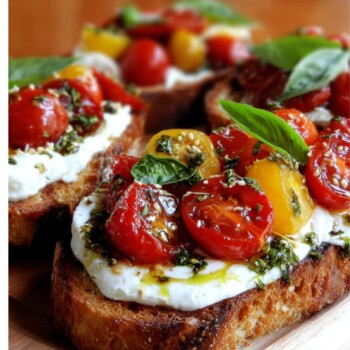 Tartines croustillantes au pain de campagne garnies de burrata crémeuse et de tomates cerises marinées au basilic. Une recette fraîche, rapide et pleine de soleil.
