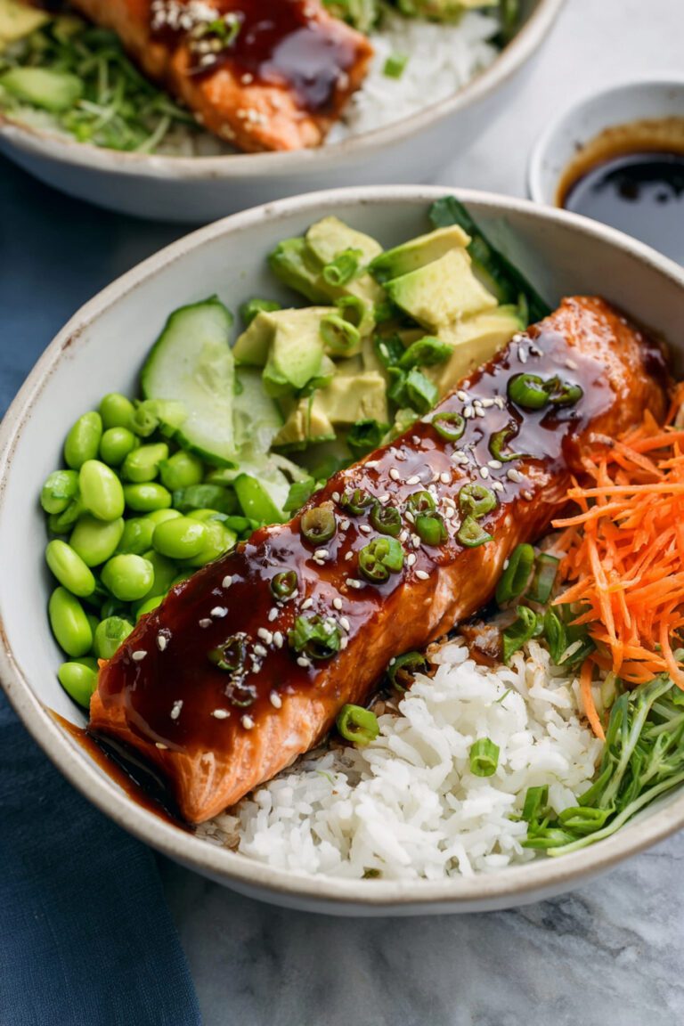 Teriyaki Salmon Bowls offer a delicious and healthy dinner option, featuring a sweet-savory balance that is both satisfying and nutritious.
